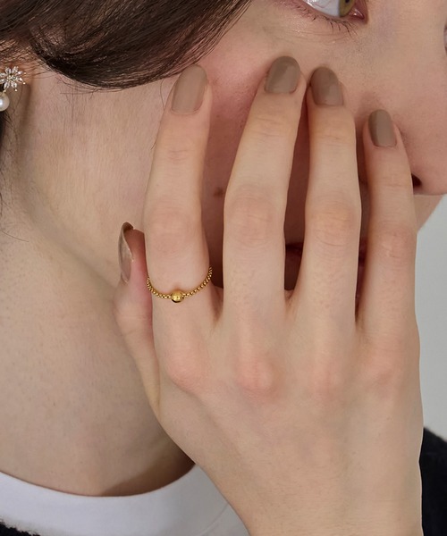 【一粒のメタルボールがアクセント!サージカルステンレス素材のチェーンリング】 重厚感のある艶やかなゴールドチェーンとメタルボールが、手元を上品に彩るデザイン。 主張しすぎないバランス感だから、他のリングとのレイヤードも楽しめます。 その日の気分で、ひとつで軽やかに。重ねて華やかに。 デイリーにも特別な日にも活躍するアイテムです。 ※チェーンが指に沿って形が変わるため、着用した際のサイズ感が11号~13号になります。 ※こちらの商品にはジュエリーBOXは付属しません。 ■サイズモチーフ:縦0.4×横0.35cm 着用サイズ:#11~#13 ~サージカルステンレス~ 腐食しにくく肌に優しい素材で、メスや注射針などの医療用器具にも採用されており、金属アレルギーの方でも安心してご着用いただけます。 その他にも水に強く、変色しにくい、とても固く変形しにくいという特徴があります。 ~洗えるアクセサリー~ 雨に濡れても、汗をかいても、汚れても、気にすることなく洗える事で常に清潔で爽やかにオシャレを楽しんでまるで身体の一部の様に身に着けてほしい... ※アレルギーの原因は様々です。サージカルステンレスはアレルギーが起きにくい素材ではありますが、全ての方にアレルギーが起きないことをお約束するものではありません。お肌に異常が見られた場合は直ちにご使用をやめ専門医にご相談くださいませ。 ------------------------------------------ #オケージョン #結婚式 #夏アクセサリー #プール #海水浴 #海 #花火大会 #浴衣コーデ #ギフト #プレゼント #汗対策 #梅雨対策 ------------------------------------------ ◆◆◆Phoebe/フィービィー◆◆◆ 欲しいものが必ず見つかる。 アクセサリー&ライトジュエリーブランド 「Phoebe/フィービィー」 ▼商品のお気に入り登録 ハートマークをクリックし、お気に入りに登録 完売商品の再入荷通知や、ラスト1点の通知、セールの通知も受け取ることができます。 ▼ブランドのお気に入り登録 新商品や再入荷等、いち早くブランドのお得な情報を受け取ることができます。