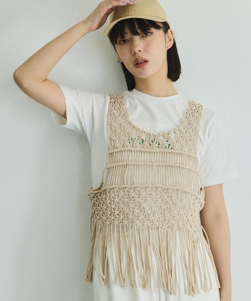 【ENIM BY VICKY/エニムバイビッキー】ファッションにはルールがない、自分の好きなスタイルを自由に。”私を私らしくする、私ウケのファッション”をテーマにユニークなデザインと実用性を兼ねたワードローブを提案レイヤードスタイリングで今年っぽさをさらにアップデートするトレンド感のあるマクラメ編みビスチェ。●POINTレイヤードで旬なスタイリングが完成するマクラメ編みビスチェ。すっきりとしたネックラインやコンパクトなシルエットで繊細かつ女性らしい印象に仕上げました。裾の大胆なフリンジがトライバルな雰囲気を演出。●FABRICナチュラルな雰囲気のマクラメ編みニット。ロングシーズンご着用いただける素材です。Tシャツやタンクトップなどとのレイヤードがおすすめスタイリング。シンプルなワンピースの上に重ねてみたり、ブラウスやタートルネックとのレイヤードも可愛いです。アウトドアなシーンやフェスのスタイリングなど、春夏ムードを一気に高めてくれます◎柔らかく軽いので、オールシーズン使える万能アイテムです。----------------------------------透け感:厚さ: 普通伸縮性:なし裏地: なしポケット: なし--------------------------------------------------------------------洗濯方法家庭洗濯:液温は40℃を限度とし、手洗いが出来る。自然乾燥:日蔭の平干しが良い。アイロン:底面温度110℃を限度としてアイロン仕上げができる。ドライクリーニング:石油系溶剤による弱いドライクリーニングができる。----------------------------------※画像の商品はサンプルとなりますので実際の商品と仕様、加工、サイズが若干異なる場合がございます。※お客様のモニター環境により実際のお色と多少異なる場合がございます。※撮影状況や光の当たり具合により、色合いが異なって見える場合がございます。