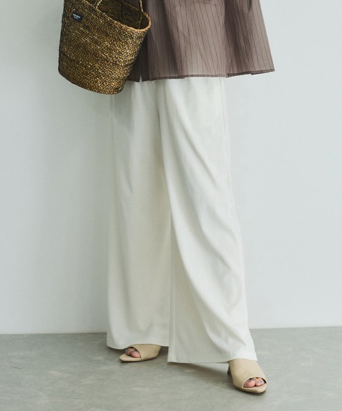 ●POINTウエストはぐるりゴムを織り込んだような仕様で、フロントはギャザーデザインになっているジャージー(カットソー)ワイドパンツです。トップスをタックインした際に気になる下腹部分に、ゆとりがでるように設計し、ボディラインを拾いにくくしています。同素材の汗染み防止ポロトップス(2310-52070)とのセットアップスタイルはもちろんですが、広がりすぎないシルエットなので、ジャケットスタイルでも合わせやすい1本です。※オフホワイトのみ裏地がついています。●FABRIC汗染み防止加工を施した毛羽の少ない表面感のジャージー(カットソー)素材を使用しています。----------------------------------透け感:淡色のみややあり厚さ: 普通伸縮性:ありポケット: なし--------------------------------------------------------------------------------------------------洗濯方法家庭洗濯:液温は30℃を限度とし、洗濯機で非常に弱い洗濯ができる。自然乾燥:日蔭の吊り干しがよい。アイロン:底面温度120℃を限度としてアイロン仕上げができる。ドライクリーニング:ドライクリーニング禁止。----------------------------------------------------------------■モデル身長 165cm 着用サイズ M※サンプルとの変更点 ポケットあり→ポケットなし※画像の商品はサンプルとなりますので実際の商品と仕様、加工、サイズが若干異なる場合がございます。※お客様のモニター環境により実際のお色と多少異なる場合がございます。※撮影状況や光の当たり具合により、色合いが異なって見える場合がございます。▼商品のお気に入り登録ハートマークをクリックし、お好きなカラーを選んでお気に入りに登録完売カラーの再入荷通知や、ラスト1点の通知、セールの通知も受け取ることができます。▼ブランドのお気に入り登録新商品や再入荷等、いち早くブランドのお得な情報を受け取ることができます。