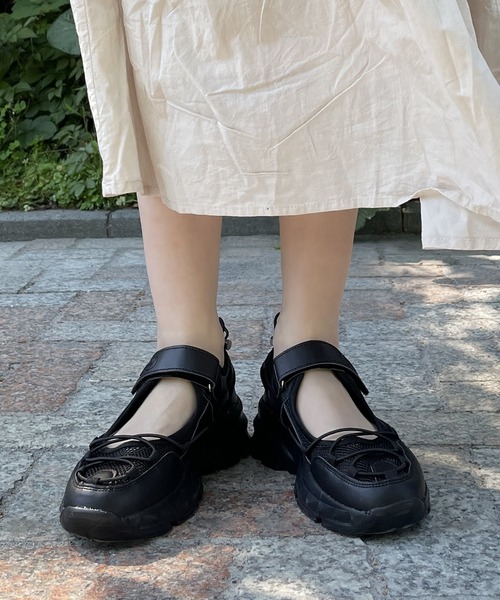 サンダルでありスニーカー!通気性が抜群のトレンドサマーシューズ 【素材】 表地:メッシュ(ポリエステル)、合成皮革 底材:合成底 【仕様】 ・ヒール高3.5cm ・軽量特殊モールド ・片足約160g(M寸) ・底裏は滑り止め溝つき ・ワンタッチベルト ・簡単着脱 ・清涼感、通気性◎ ・足長効果 ・アクティブ、トラベル、リゾート、タウン使いOK 【デザインポイント】 ダッドソールでアクティブなスニーカーの風合いを残したサンダルデザインは使いやすさとインパクトが◎。カジュアルスタイルはもちろん、ワンピースやスカートなどにも相性が良く夏のスタイリングにかかせません。 アッパー素材は通気性抜群のメッシュ素材を使用。 ワンタッチで着脱が簡単な甲ベルトでしっかり足をホールドし、アクティブなシーンでも活躍します。 安定感のある軽量ソールとふかふかのクッションは長時間の使用でも負荷をかけず快適歩行が可能。 らくちんにスタイルアップが目指せます。 素足でも靴下着用でも快適にお過ごしいただけるデザインはこの夏に活躍すること間違いなしです。 【詳細】 ・ヒールの高さ…かかと側3.5㎝ ・サイズ…S=22.0 M=23.0 L=24.0 LL=24.5 ・片足160g(M寸時) ■お買いものをよりお楽しみいただくには ◆商品のお気に入り登録 完売カラーの再入荷通知、残り1点の通知、セール等値下げした時の通知も受け取ることができます。 ◆ブランドのお気に入り登録 新商品や再入荷など、いち早くブランドのお得な情報を受け取ることができます。 是非ご活用ください。