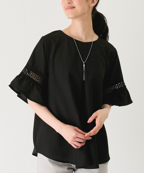 【デザイン・シルエット】清涼感のある生地がナチュラルな着こなしを叶えるブラウス。袖には繊細なレースのカットアウトを施してあります。ゆったりとしたシルエットで、リラックスした着心地を提供しつつも、落ち感のある風合いでスタイリッシュな見た目を演出します。腰回りもカバーしてくれる優秀アイテム。ワードローブに加えることで、カジュアルからちょっとしたお出かけまで、幅広いシーンで活躍する一枚です。サイズ感やディテールにこだわった、季節を問わず長く愛用いただけるアイテムです。【素材感】清涼感のあるさらっとした素材【カラー】01クロ 07グレー 10シロ 30グリーン 40コン 44ブルー 80イエロー【スタイリングポイント】デニム等のパンツスタイルがおすすめ。細身のスカートに合わせるとエレガントなスタイリングが叶います。首元が開くデザインなので華奢なネックレスをポイントにするのもおすすめ。デイリーコーデに大活躍の一枚です。裏地:なし光沢感:なし透け感:レース部分あり、身頃若干ありポケット:なし伸縮性:なし生地の厚さ:薄手~普通ボタン:なしその他仕様:なし季節:春夏※撮影時の光、お使いのモニター環境によって色の見え方が違う場合がございます。予めご了承ください。モデル身長:170cm 着用サイズ:F