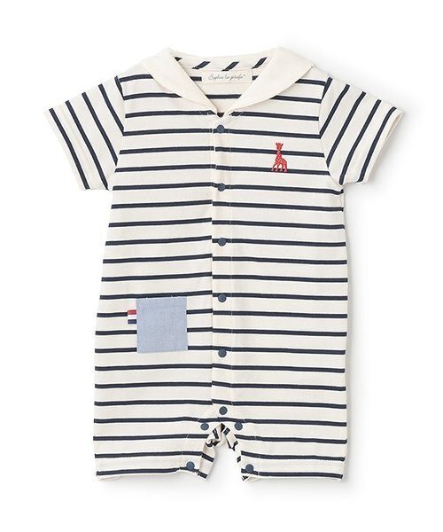 ボーター生地とセーラーカラーを組み合わせたマリン風ショートオールです。ソフィー刺しゅうの配色が可愛らしいポイント。フロントにあしらったポケットもアクセントです。肌当たりが良い綿100%素材で、やさしい触り心地を実現。扱いやすいスナップボタンを配置しました。【おすすめの着用時期は春夏シーズン】【透け感】透けない【生地の厚さ】普通【伸縮性】あり【裏地】なし【ポケット】なし【アジャスター】なし
