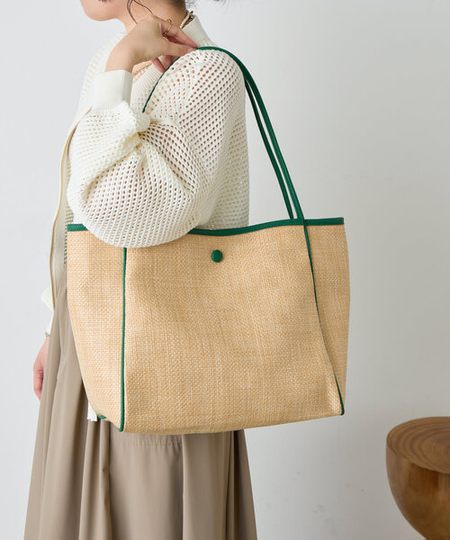 -商品ポイント-・上品な艶感のあるラフィア素材で、カジュアル過ぎない大人の女性のためのトートバッグ。・軽やかで風通しも良く、ナチュラルな風合いで暑い夏にぴったりのバッグ。・A4サイズのファイルやタブレットもすっぽり収まるたっぷりとした収納力で、 旅行やショッピングにも最適です。・肩掛けもできるハンドルは長時間持っていても疲れにくく、使いやすいデザイン。・ブラックのカラーは全体的に同色でシックで品のある女性らしい印象に。 グリーンのカラーはパピングデザインとボタンもが全体のアクセントになり、上品な雰囲気をさらに引き立ててくれます。・カジュアルなスタイルにも、リゾートスタイルにも自然と溶け込み、ワンランク上のコーディネートに仕上げてくれます。ー注意事項ー・画像の商品はサンプルです。実際の商品と仕様、加工が若干異なる場合があります。・サイズ表記はあくまで目安となります。【お買い物をよりお楽しみいただくために】―気になるアイテムはお気に入り登録をしておくと便利です―・お気に入り登録した商品はメニューの「♡お気に入り」ボタンから、一覧表示することができます。・商品の再入荷・在庫ラスト1点などの情報を受け取ることができます。・値下げやクーポン情報を受け取ることができます。・予約商品は通常商品切り替わり時にお知らせがきます。スマートフォンの場合・・・商品画像右上に表示されている「♡」をタップしてください。パソコンの場合・・・「カートに入れる」ボタン横に表示されている「♡」をクリックしてください。ーPALCLOSETアプリのブランドフォローがおすすめですー・新商品やお得な情報をいち早くcheckする事が出来ます。・スタッフコーディネートや店舗ごとのブログをお楽しみ頂けます。__________________________________※取り扱いについては、商品についている品質表示でご確認ください。※照明の関係により、実際よりも色味が違って見える場合があります。またパソコン・スマートフォンなどの環境により、若干製品と画像のカラーが異なる場合もございます。予めご了承ください。※詳細画像の色合いをご参照ください。予めご了承ください。