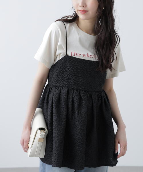 程よいシアー素材の凸凹感が軽やかな印象の、意匠感のあるエンボスジャガード素材が目を惹くキャミビスチェ。 幅広いスタイリングに活躍してくれるチュニック丈です。 ウエスト切り替えにギャザーを入れ、ふんわりとしたシルエットがかわいいデザイン。 まっすぐなラインの胸元と華奢な丸紐リボンが上品な印象で、背中は丸紐リボンで身幅の調節が出来ます。 半袖カットソーやタンクトップなど、合わせるインナーを選ばず着回せます。 デニムやショートパンツ合わせでカジュアルなスタイリングがおすすめです。 ※モデルの着用画像の場合、光の当たり具合により、実際の色味と異なって見えることがございます。色味は、商品単体の画像をご参照ください。 商品特性 ■透け感:なし ■生地の厚さ:普通 ■裏地:なし ■伸縮性:なし ■光沢:ややあり ■シルエット:スタンダード --------------------------------------------------- ◆商品のお気に入り登録◆ お気に入りアイテムの値下げ・再入荷・在庫1点などの通知を受け取ることができます。 ◆ブランドのお気に入り登録◆ 新商品や再入荷、セール、クーポン配布などお得な情報を受け取ることができます。 ---------------------------------------------------