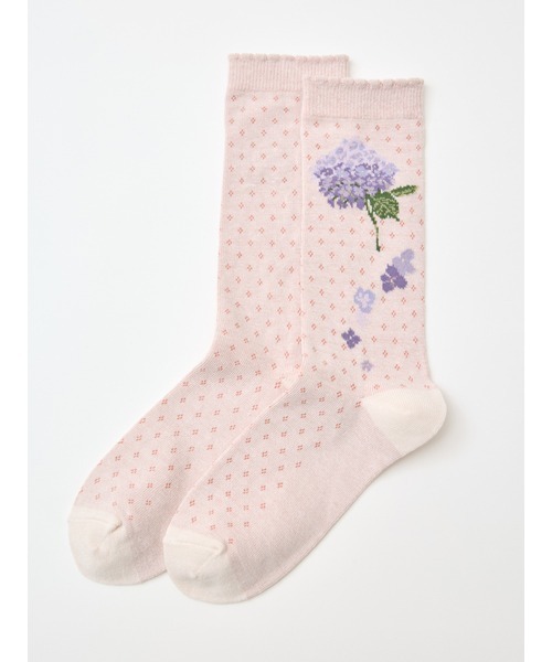 あじさい爽やかな風に柔らかに揺れる優しい青に紫に。ちいさな星の集まりのように鮮やかに変わってゆく色合いもとても素敵で両手で包むように触れるとその柔らかな夢が花びらのようでふんわりと優しくなれるそんな花。あじさいの花は中心のとっても小さな丸い部分が蕾で花びらのように見える部分は実は花ではなく、装飾花と呼ばれるもので花のがくの部分になります。合わさってはじめておなじみのシルエットに見えるとても不思議なお花です。色も様々な色合いのものが見られて、一枚ずつの色の移り変わりが見ていてとても楽しいです。そんな”あじさい”をモチーフにしたソックス。小紋柄のソックスにそれぞれのカラーに合わせた”あじさい”をワンポイントに。あじさいの花が映える爽やかな淡い色合いの”アイボリー””シェルピンク”と”ミント”はそれぞれお花の色合いをすこしづつ変えてアレンジ。”ネイビー”は、はっきりとした締め色でポイントに青い花色が鮮やかに浮かぶようにすっきりとした色合いに。