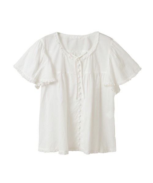 シンプルに着られる綿ローンのブラウス。ひらひらと広がるフレアなお袖がなんとも可愛らしい。首まわり、袖まわり、裾まわりと軽やかなフリルの縁取りを施して。身ごろは胸もとに切り替えの入ったのみのシンプルなデザイン。切り替えは背中のところにも施して後ろすがたもスッキリと着られます。フロントにはずらりくるみボタンを敷き詰めて清楚で可憐な装いに。首もとには細幅のリボンを結んでポイント使いに。