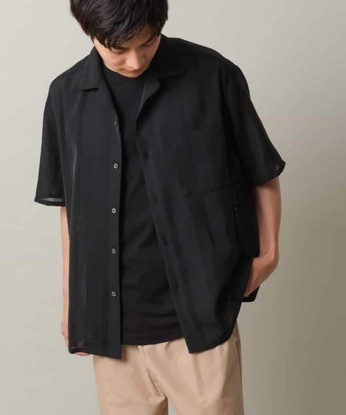 ◆【イージーケア/洗濯機で洗える/速乾/接触冷感】今夏のトレンド素材! カラミ織り素材にランダムストライプを表現したオープンカラーシャツ◆ 【デザイン】 カラミ織りの”透ける”部分をうまく用いて、ランダムストライプ柄を表現したオープンカラーシャツ。 ゆとりのあるワイドシルエットで肘が隠れる程度の五分袖でリラックス感のあるトレンドシャツです、 羽織るだけで大人のリラックススタイルになる夏にぴったりの一枚です。 【素材】 カラミ織りは、生地に隙間を作る織り技術の一種。 生地に透けができ、通気性が高く夏にぴったりな生地です。 しわになりにくく、速乾性があり、サラッとした肌触りがポイント。 イージーケア、ご自宅で洗濯機洗いができるためデイリーユースに着用できるのも嬉しいポイントです。 接触冷感機能がついているため夏の暑い時期でも涼しく着用頂けます。 【スタイリング】 シャツハオリとしてシンプルに無地カットソーやノースリーブTとあわせたり、シャツの裾がスクエアカットのため、インナーにはロングシルエットカットソーとの裾レイヤードスタイルでトレンドの着こなしができる汎用性の高いアイテムです。 ボトムはきれい目スタイルであればスラックス合わせ、カジュアルスタイルであればゆとりのあるパンツとあわせるとバランスが良いコーディネートができます。 ---------------- 透け感:あり 裏地:なし 伸縮性:なし 光沢感:なし 生地の厚さ:やや薄手 ---------------- ≪お気に入り登録機能の使い方≫ ■商品のお気に入り登録(ハートマークをクリック) 再入荷通知や値下げ等、お得なご案内を受けることができます。 ---------------- ※商品画像は、光の当たり具合やパソコンなどの閲覧環境により実際の色味と異なって見える場合がございます。 商品の色味の目安は商品単体の画像をご参照ください。
