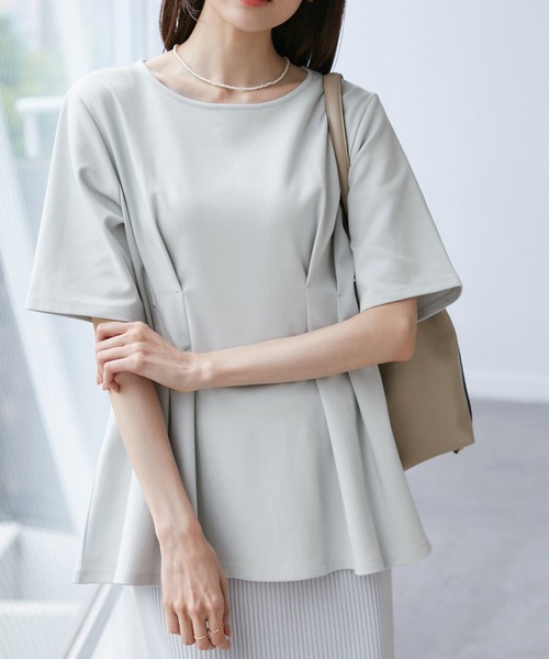 気になるウエスト周りをおしゃれにカバーするペプラムトップス【素材感】・素材はやや厚めのカットソー素材で、淡い色でもインナーの透けを気にせず使える。・UVカット(紫外線遮蔽率90%以上)、ひんやりとした肌触りの接触冷感。【デザイン・シルエット】・ウエストタックで程よくシェイプ。着るだけで綺麗なくびれのラインができる1着。・ウエスト部分は程よくゆとりを持たせた寸法にしているので窮屈感なく綺麗に見せてれる。・ペプラムシルエットで丈はしっかりあるので気になる腰回りもカバー。【カラー】・ブラック、ホワイト、ライトグリーン、ブルーの4色展開。・ブルー系(47)はグレーがかったブルーグレーのような色味になります。【スタイリングポイント】・すっきりシルエットのパンツや、アイラインスカートと合わせたスタイルがおすすめ。-----------------------------裏地:なし透け感:なし、ホワイト(10)はややあり伸縮性:あり生地感・厚さ:普通季節:夏-----------------------------※撮影時の光、お使いのモニター環境によって色の見え方が違う場合がございます。※モデル身長:165cm 着用サイズ:38