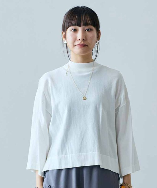 コットンを上品に。表面感の美しいミコニットトップスミコニットのさらりと美しい目面で、コットン100%の心地を上品に着られるショートトップス。控えめに立ち上げたモックネックがシャープな印象。体形をきれいに見せる適度なゆとりのボックスシルエットに、リラックスした八分袖で動きやすく。前後差をつけたすそは、太めにとったすその縫い代幅で、広がりすぎずすっきり着られます。※フェリシモの商品には、紐などでくくられている紙タグは付属しておりません。