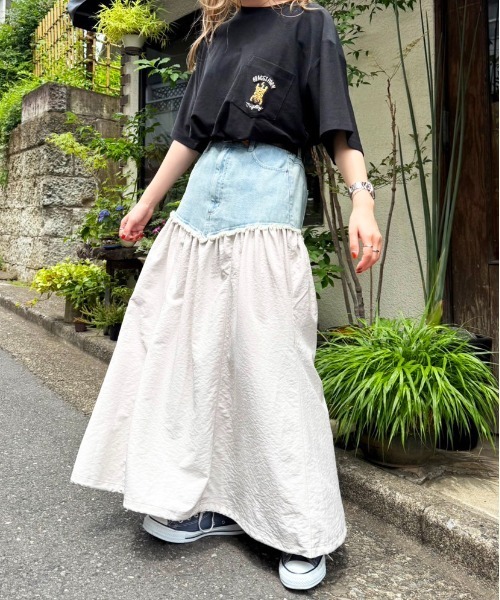 ■デザイン\異素材MIXで、一枚でキマる主役スカート!/デニム×ポリエステルの異素材ドッキングが目を引くデザインで、シンプルなトップス合わせでもグッとお洒落に見える一本◎裾を絞れば、今っぽいバルーンシルエットに変化!腰回りはスッキリ見えるよう計算された美シルエットで、「ラクなのに、スタイルよく見える」が叶うこだわりの一枚です。トップスをインしてもアウトしてもサマになる、着回し力も抜群!季節問わず着られる万能スカートで、ワードローブの主役にぜひ◎■ポイントダブルネームスカートドッキングスカートデニムスカートDOUBLE NAME恐竜ミニレックス■素材・ウエストゴム:後ろ部分のみあり・伸縮性:なし・透け感:なし・光沢感:なし・生地の厚み:薄い※生地寄りの画像が実際の色味と近いものとなります。※ご覧のモニター環境や撮影環境により実際のカラーと異なる場合がございますので画像をご参照の上、ご了承頂けますようお願い致します。