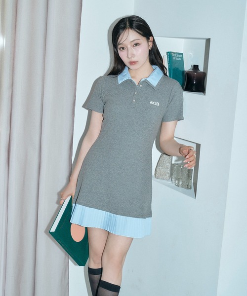 ダブルカラーがアクセントで、伸縮性のあるリブ生地と、衿と裾プリーツにシャツ生地をドッキングしたワンピース。