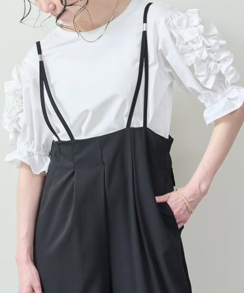 甘さを抑えた、大人のフリルT 【Material】 ストレッチ性のあるやや厚手のカットソー素材を使用。 肌当たりがよく、デイリーに着やすい快適な着心地が魅力です。 【Design】 シンプルな無地Tシャツをベースに、フリルモチーフをドッキングしたデザイン。 異素材風の立体感がアクセントとなり、1枚で着映えするトップスです。 カジュアルながらもフェミニンで大人っぽい印象に仕上げています。 【Size】 ゆったりめのシルエットとちょうどいい着丈で、タックイン・アウトどちらも決まりやすい万能バランス。 全体的に少しゆったりめなのでストレスなく着ていただけます。 【Styling point】 デニムやスラックスと合わせたシンプルなコーデでもサマになる1枚。 ネックレスやアクセサリーをプラスして、より女性らしい着こなしもおすすめです。 【商品特性】 透け感:あり 裏地:なし 伸縮性:あり 光沢感:なし 生地の厚さ:普通 ▼お気に入り登録 アイテムをお気に入り登録・・・再入荷やラスト1点、セールなどの情報をお知らせします! ブランドをお気に入り登録・・・新作や販売開始のお知らせを受け取れます! ※撮影時の光の加減やご使用の端末により、実際の色味と異なる場合がございます。あらかじめご了承くださいませ。
