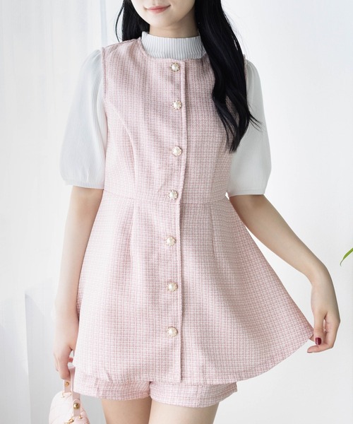 コーデが決まる!サマーツイードフロントボタンチュニック&ショートパンツセット【デザイン】大人気だったツイードのセットアップが夏生地になりました。ビジューボタンやツイード生地から高見え間違いなしです!セットでも別々でもご着用いただけますので、コーデの幅が広がります♪【素材感】着心地の軽いポリエステル素材伸縮性:なし/ 透け感: アイボリーの若干あり/ 裏地:なし/ウエストゴム:あり 水洗いによる洗濯不可 / ドライクリーニング可【コーディネート】セットアップでご着用いただき、足元はサンダルやミュール合わせがオススメです!半袖ニットやTシャツをインナーとしてもご着用いただけます◎【※お取り扱い上のご注意】1:モニター環境等により実際の商品と多少色味が異なって表示される場合がございます。予めご了承下さい。2:屋外で撮影された商品は、天候により多少実際のカラーと異なる場合があります。商品のカラーはトルソー(マネキン)の商品画像をご参照ください。3:濃い色の商品は、お洗濯や摩擦等による移染にご注意ください。4:末永くご愛用頂く為に、アテンションタグ・洗濯ネームを必ずご確認の上、着用又はお取り扱い下さい。5:生産時期により、色、サイズ、デザイン、素材の質感が多少が異なる場合がございます。あらかじめ御了承下さいませ。