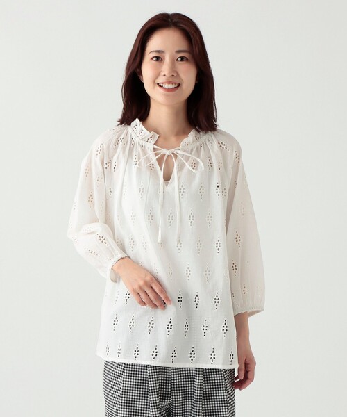 シフリー刺繍を施した、コットン仕立ての7分袖ブラウスです。首まわりに配したフリル襟がかわいらしいアクセントになった1着。紐を絞ったり緩めたり調整することで、見え方のアレンジを楽しめます。紐を解いて少し襟を抜いて着用すれば、また異なった雰囲気に。ふんわりと丸みを帯びたスリーブのシルエットが、装いに華やかな印象をプラスします。シンプルながらも存在感があるデザインなので、スタイリングの主役にぴったりです。カラーはオフホワイトとブラックの2色から、気分や好みに合わせて選んでくださいね。色違いで揃えるのもおすすめですよ。 *濃色製品は色落ちしますので他のものと分けて洗濯してください。洗濯前のつけ置きや濡れたままで長時間放置しないでください。 *洗濯の際はネットを使用してください。 *アイロンを掛ける際はあて布を使用してください。 *この製品は素材の特性上、多少のネップ(繊維の小さなかたまり)や織りムラ、色ムラなどがあります。 *1点ごとに柄の出方が違うことがあります。