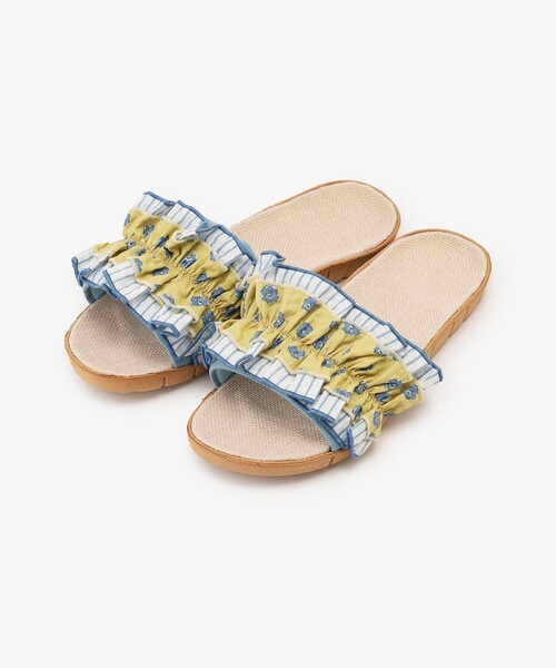 イエローを基調にしたカラーリングで夏のお部屋と生活に彩りを加えるルームシューズです。 リップル加工を施した生地を2重仕立てのフリルにしてフェミニンな雰囲気をプラス。裏面までゴムなので家の中だけでなくベランダ用や玄関用にもおすすめです。汚れが気になったら丸洗いしてさっぱりときれいにして使ってくださいね。 *適応サイズ/23.0~24.5cm *1点ごとに柄の出方が違うことがあります。