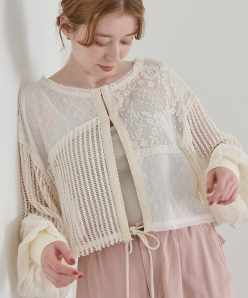 【繊細なレースと異素材ミックスのパッチワークデザインが魅力の華やかなシアーカーディガン】 ・表側に縫い目を見せてリメイク感を出した繊細なパッチワーク ・衿ぐりと裾は自然にほつれが出るカットオフデザインに ・生地はそれぞれ透け感があるので夏の羽織にもぴったり ・前あきはホック留め仕様、チュラルな雰囲気を崩さないコットンテープで仕上げました ・ゆるっとしたサイズ感でリラックスな着心地、ショート丈でコーデのバランスが取りやすく羽織るだけでこなれた印象に ~スタイリング~ 同素材のスカートとセットアップでの統一感のある着こなしはもちろん、デニムやミリタリーパンツとカジュアルに着るのもおすすめです。 Tシャツやタンクトップにレイヤードしてヘルシーな透け感を楽しむのも◎ トップスとしても羽織りとしてもお使いいただける優秀アイテムです。 - - - - - - - - - - - - - - - - - - - - - - - - - - - - - - - - - 透け感:あり 裏地:なし 伸縮性:ややあり 光沢感:なし 洗濯: 手洗い推奨 - - - - - - - - - - - - - - - - - - - - - - - - - - - - - - - - - ●シリーズ展開もご用意してあります。 パッチワークレースレイヤードスカート[c2R3600] アイテムページはこちら ※着用、お取り扱いの際は、商品についている品質表示とアテンションタグを必ずご確認下さい。 夏服/春服/レーストップス