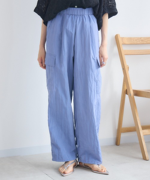 裾ドローコードでシルエットを自在に操る、軽快ナイロンワッシャーパンツ[素材]・ポリエステルとナイロンをブレンドした、軽やかで程よいハリ感のある素材を使用。・あらかじめワッシャー加工が施されているため、着用中のシワが気になりにくく、こなれた風合いが魅力。[デザイン]・デザインのアクセントとなる、両サイドのカーゴポケットが旬なムードを演出。・裾のドローコードは、きゅっと絞ることで足元にボリュームを持たせたパラシュートパンツのようなシルエットにアレンジ可能。・ウエストはぐるりと一周ゴム仕様になっており、締め付け感のない楽な履き心地。[スタイリング]・フェミニンなブラウスや、コンパクトなニット、ジャケットなどを合わせて、甘辛ミックススタイルに。・シンプルなTシャツやカットソー、メッシュニットなどを合わせて、こなれた大人リラックススタイルにも◎■光沢感:あり■透け感:なし■伸縮性:なし■生地の厚さ:薄手システムの都合上、店舗より入荷が遅れる場合がございます。照明や光の当たり具合で色味が違って見える場合があります。<25SS Collection 25Spring&Summer>【お買い物をよりお楽しみいただくために】・商品のお気に入り登録をおすすめします!♡マーククリックで登録できます。完売カラーの再入荷や、ラスト1点になったときの通知、セールの際に通知などお得な情報を受けることができます。・ブランドのお気に入り登録もご一緒にお願いいたします!新商品や再入荷、などいち早くブランドの最新情報をお届けします。
