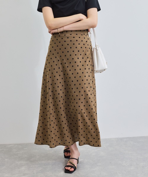 今シーズンマストのドットスカート!◆2025春夏◆ <POINT> ・クラシカルなイメージのポルカドットが大人フェミニンのスタイリングをアップデートしてくれます。 【デザイン・シルエット】 スカートの身頃をバイヤスに裁断する事で、ウエストから裾にかけての綺麗なドレープが細見えするシルエットに仕上げています。 【素材】 ドレープ性のある薄手のポリエステルを使用しています。 裏地付き。 【カラー】 黒ベース×オフ白ドットプリント、ブラウンベース×ブラックドットの2色展開。 【おすすめのスタイリング】 シアーニットやフレンチスリーブブラウスの無地など、シンプルフェミニンなスタイルがおススメです。 ----------------------------- 裏地:あり 光沢感:なし 透け感:なし 伸縮性:なし 生地の厚さ:薄手 ウエストゴム:後ろゴム仕様 ファスナー:あり(サイド) 季節:春、夏、初秋 ----------------------------- 【モデル着用サイズ】 全色モデル身長:164cm、骨格:ナチュラルとストレートのミックス 着用サイズ:M ※画像の商品はサンプルです。実際の商品と仕様、加工、サイズが若干異なる場合がございます。 ※画像によっては実際の色味と異なる場合があります。正しい色味は生地アップ画像をご確認ください。