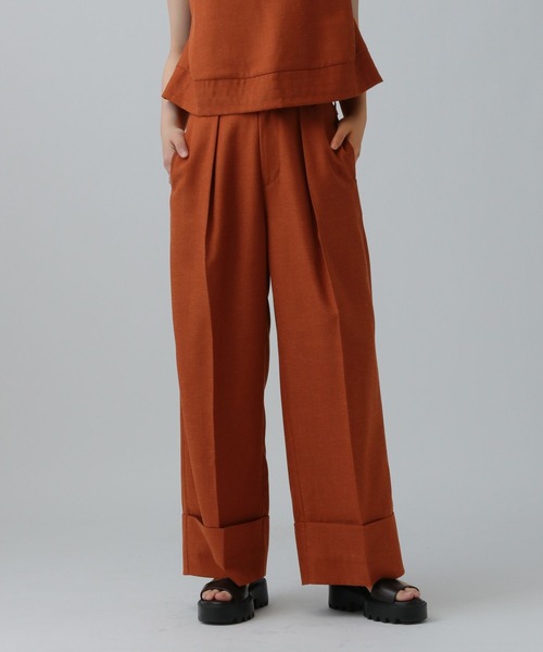 夏らしいリネン混のスラックスパンツ【デザイン】綺麗なシルエットのパンツです。シンプルながらフロント部分のタックや、裾の折り返しデザインがポイントになっています。【スタイリング】・同素材のブラウスと合わせたセットアップスタイルがおすすめです。【セットアップ可能アイテム】☆324947 リネンブレンドノースリブラウス---------------------------------------------------【気になる商品はお気に入り登録がおすすめ!】・在庫残りわずか・再入荷・セールの情報などの通知を受け取ることができます。気になる商品は♡をクリックして、「お気に入り登録」しましょう!【ショップ・ブランドのお気に入り登録も!】新商品や再入荷、セール、クーポンの配布など、いち早くお得な情報を受け取ることができます。---------------------------------------------------
