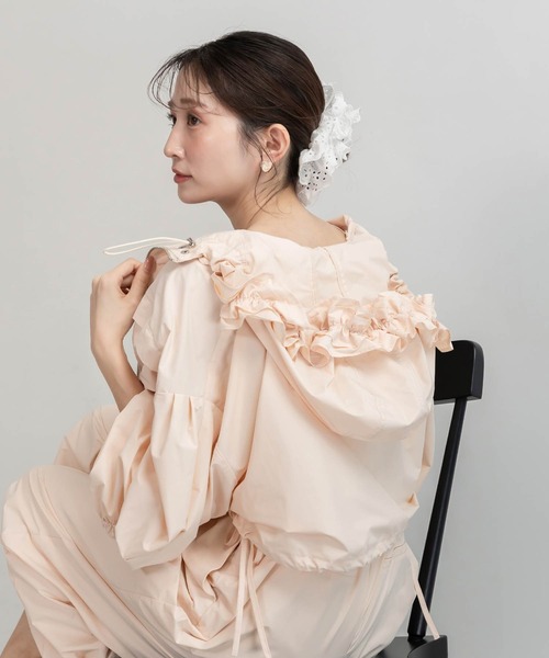 ◆2025SS新商品◆ フードの大ぶりなフリルデザインが目を惹く、360度着映えするマウンテンパーカー。 程よいカジュアルさの中に、フェミニンさを引き立てるこだわりのディテールが光る一着。 アウトドアにもデイリーユースにも対応できる万能アイテムです。 POINT ・ボリューム感がありながら、軽量でノンストレスな着心地を実現 ・高めのスタンドカラーでシャープな印象に ・フード部分は頭をすっぽりと覆う大きめサイズ ・裾に施したドロストコードで自由にシルエットの変化が可能 ・ファスナーやボタンなどの金具を全てシルバーで統一し、上品な印象に ・バックスタイルまで抜かりなく、360度着映えする一着 ・生地に撥水加工/UV50%カットを施しているため街歩きやレジャー用のアウターとしても活躍するアイテムです COORDINATE シンプルなボトムと合わせる事で、フリルが程よいアクセントになり、女性らしさを引き立てます。 同素材で制作したフリルコンビネゾン(BD35318)と合わせてセットアップで着用していただくのもおすすめです。 - - - - - - - - - - - - - - - 洗濯方法:家庭洗濯不可 透け感:ややあり 裏地:なし 伸縮性:なし 生地の厚さ:薄手 - - - - - - - - - - - - - - -