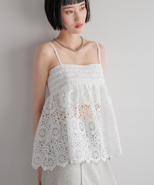 ■素材■ハンドメイド風の見え方にこだわった、ソフトで膨らみ感のあるレース生地。手編みのクロッシェレースように編み目が荒く、立体的な仕上がりで、目を惹く幾何柄が特徴的。シアー感とクラフト感を合わせ持つ今期一押し素材です。■デザイン■総柄レースが華やかな印象のキャミ。着丈は腰回りをカバーしてくれる丈感で、安心感もプラスしてくれます。肩紐は調節可能となっています。■スタイリング■お手持ちのTシャツやタンクなどにプラスオンすれば、一気にスタイリングが華やかになるアイテム。春夏らしい印象に仕上げてくれます。ボトムはカジュアルなボトムスでも、キレイ目なパンツとも相性〇。