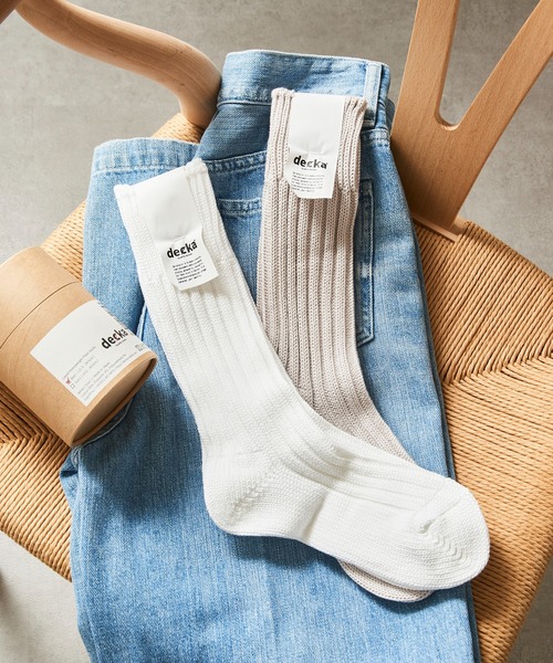 日常を、少しだけ特別に。コットン混で快適なソックス。■point一般的なソックスの約5倍の太さの糸を、希少な旧式の編み機でゆっくりと編み立てることで、圧倒的な耐久性と肉厚な生地感を両立。足を締め付けない優しいフィット感で、長時間の着用でも快適さが持続します。見た目はプレーン、履き心地はラグジュアリー。日本国内の熟練職人によって丁寧に生産されたこの靴下は、カジュアルからキレイめまで、どんなスタイルにも自然と溶け込みながら、さりげなく足元の印象を引き締めてくれます。【decka®(デカ)】「良質な脇役でありたい」という哲学のもと、靴下という日常アイテムに対して真摯に向き合うブランド。≪お気に入り登録≫でお得な情報盛りだくさん・“商品のお気に入り登録”で再入荷通知やラストの通知、セール通知も受け取ることができます。・“ブランドのお気に入り登録”で新商品や再入荷など、お得な情報を受け取ることができます。※ご注文いただいた予約商品のお届け時期の確認は、注文履歴ページより行えます。