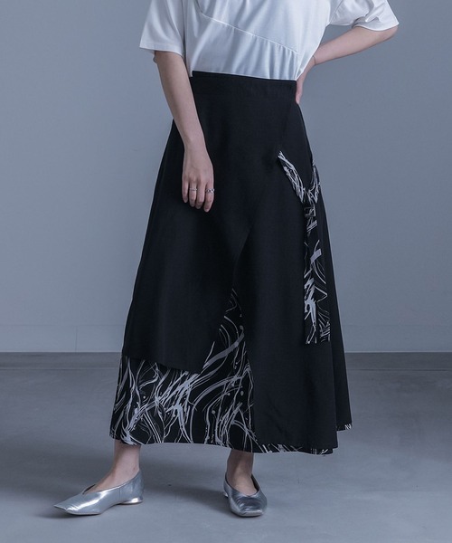 ■デザイン ペイント柄生地に無地の生地をアシンメトリーにドッキングしたフレアスカート。ウエストのラップ風のデザインやクロスに固定されたベルトでさりげなくアクセントをプラスします。 ウエスト後ろはゴム仕様のため、簡単に着脱可能なのも嬉しいポイント。 ■コーディネート 存在感のあるスカートなので、シンプルなTシャツと合わせるのはもちろん、シャツ・ブラウス・ジャケットなどを合わせたきれいめなスタイリングもおすすめです。 アシンメトリーの個性的なデザインですが幅広いスタイリングにマッチします。 ■素材 表地には、さらりとした肌触りの生地を使用。 膝上まで滑りのいいポリエステル100%の裏地付きで、インナーが透けることを気にせずにご着用いただけます。 薄手の生地感のため、涼しげな印象をプラスできます。