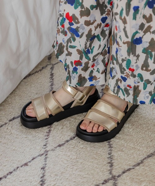フェイクレザーを使用したキレイ見えするスポーツサンダル レザー見えするベルトが大人っぽく上品な厚底サンダル。 フェイクレザーを使用することでスポーティーになりすぎず女性らしい印象に仕上げました。 ホールド力の高いアッパーとフッドベッドになっており、 スニーカーのようなホールド力と安定性で疲れにくい。 厚みのあるソールなのでスタイルアップ効果も♪ ベルトはマジックテープとゴムのW仕様で簡単に着脱できます。