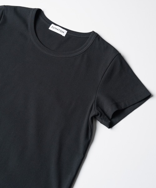 【ESTNATION(エストネーション)】通常よりも撚りの強いコットン強撚糸と縮みの軽減にもなるポリウレタン弾性繊維を使用したフライス生地のカットソー。染色時の熱処理によりスパンデックス同士が融着する糸を使用しているので、高い伸縮性と心地よいフィット感を兼ね備えた快適な素材です。 襟ぐりの襟幅をやや太めにすることでポイントにしたコンパクトTシャツ。ストレッチも入った素材を使用することで程よくフィットし、着用しやすいアイテムに仕上げています。■こちらは手洗い可能な商品です。同素材アイテムノースリーブトップス品番 :51-109-13-050300【お買い物をよりお楽しみいただくために】▽商品のお気に入り登録(ハートマークをクリック)完売カラーの再入荷通知や、ラスト1点の通知、値下げの通知を受けることができます。▽ブランドのお気に入り登録ESTNATIONのトップページ右上にある「お気に入りショップに追加」を押していただくと、新商品や再入荷など、いち早くブランドのお得な情報を受け取ることができます。