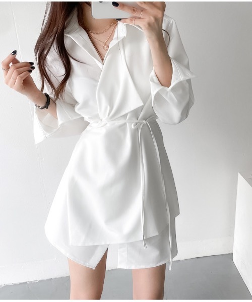 シンプルなのに、計算ずく。着るだけで"美シルエット"こなれ韓国スタイル。ウエストをキュッと引き締めるラップ風のデザインが特徴のシャツワンピース。計算されたドレープ感が身体のラインを美しく見せてくれるので、着るだけで細見え効果◎こなれ感が演出できる!と人気のデザインです。一枚でワンピース風に、ショートパンツと合わせてセットアップ風にも楽しんでいただけます。シンプルだけど映える、大人の韓国ファッションにぴったりな一着です。▼COORDINATEゴールドアクセサリーやチョーカーで"韓国お姉さん感"UP!足元は、ロングブーツでモードに。スニーカーで抜け感を作って。黒のショルダーバッグで引き締めると、より都会的な雰囲気に仕上がります。▼FABRIC・・・・・・・透け感: なし裏地:なし伸縮性:なし光沢感:あり生地の厚さ:薄手・・・・・・・▼STAFF REVIEWスタッフが商品を着用した感想をご紹介いたします。着心地についてぜひ参考してください。◉スタッフE身長152cm/骨格ストレート▼ATTENTION・・・・・・・・◼︎店頭及び屋外での撮影画像は光の当たり具合により多少色味が異なって見える場合がございます。予めご了承ください。◼︎サイトに表示されておりますカラー表記と、商品のタグのカラー名が異なる場合がございますが、実際の商品のカラーは画像と相違ございませんのでご安心くださいませ。◼︎サイズ感等若干の誤差が生じる場合がございます。1~2cmの誤差は予めご了承ください。上記注意点での返品・交換はお断りいたします。ご了承の上お買い求めくださいませ。・・・・・・・・最新情報やコーディネートなど詳しくは公式Instagramをご覧ください!▼▽もっと便利に楽しくお買い物いただくために《お気に入り登録》▽▼《商品のお気に入り登録》 [カートに入れる]右側のハートマークをクリック!〔完売カラーの再入荷通知・ラスト1点の通知・セールの通知〕を受け取ることができます。《ブランドのお気に入り登録》ブランドタグのページからお気に入りをクリック!〔新商品・再入荷など〕いち早くブランドのお得な情報を受け取ることができます。