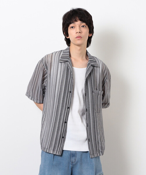 《デザイン》今年のトレンドアイテム、レース素材を使った開襟シャツです。マルチカラーがPURPLE&YELLOWらしい1枚です。シャープなイメージのあるストライプ柄のレース素材なのでユニセックスで着ていただけます。身頃は程よくゆとりのあるリラックスシルエット。Tシャツやタンクトップの上に重ねて涼しく着ていただけます。秋口には長袖カットソーの上に重ねて着るのもOKです。レースに色々な色が入っているので他のアイテムはシンプルにしてシャツを主役にコーディネートするのがおすすめです。《素材》マルチカラーレース多色の糸をレース編みにしたマルチカラーストライプレース素材です。サラッとした風通し良い素材で夏も快適に涼しく着ていただけます。裏地:無し伸縮性:無し光沢感:無し生地の厚み:薄手※画像の商品はサンプルとなりますので実際の商品と仕様、加工、サイズが若干異なる場合がございます。※こちらの商品はFIVE FOXes独自の採寸方法となっています。本サイトのサイズガイドと採寸方法が異なる場合がありますのでご了承ください。