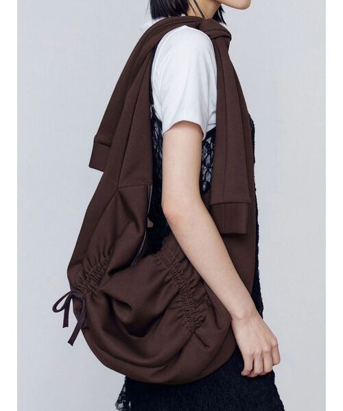 ダンボールニット生地で作成したショルダーバッグ ■デザイン くたっと落ち感のある素材でカジュアルな雰囲気もありつつ、綺麗めな表面感なので上品な印象でもお持ちいただけます。 フロントのギャザーやリボン、ショルダーのノットデザインが今季らしい印象に。 ショルダーの結び目はほどいて好きな長さに調節可能。 夏のお出かけにぴったりな大容量バッグです。 ※着用画像はフラッシュの加減で実際の製品と色味等が異なる場合がございますので、生地のズームアップ画像をご確認ください。 ※ご利用の端末画面の設定により実際の商品と色味が異なる場合がございます。