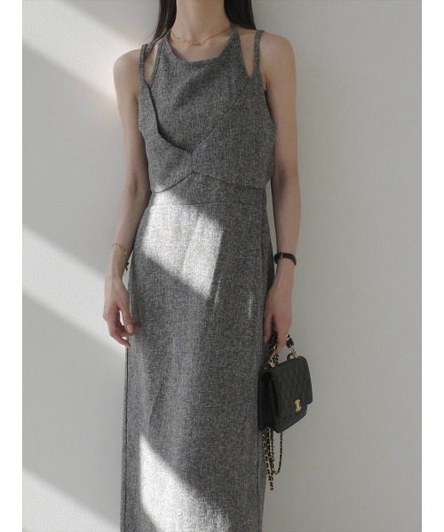 【デザイン&ディテールポイント】上品なサマーツイードのアメスリキャミワンピース。 軽やかで涼しげなサマーツイード生地を使用し、トレンドライクなビスチェ見えデザインとアメスリがこなれ感を演出。後ろはシャーリング仕様で着心地が良く、肩紐で長さ調節が可能。また、ネック部分はリボンデザインでバックシャンなワンピースです。しっかりと丈感もあるので、高身長の方へもおすすめのワンピース。ブラック、グレー、アイボリーの3色展開です。【コーディネートポイント】ボディー部分は比較的ゆとりがあるので、TシャツやロンTなどインナーを重ねてオールシーズン着用が可能。ジャケットを羽織ればオフィスでも着回し可能。