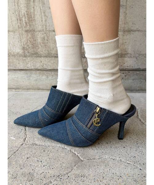 ■デザイン切り替えデザインとジップ部分のEデザインのチャームがポイントのポインテッドトゥのミュールです。ポインテッドトゥのため美脚効果のある一足です。インディゴはデニム素材、ブラックは合皮素材を仕様しています。ステッチを太めの番手にしているため、シンプルながらもこなれ感のある仕上がりです。
