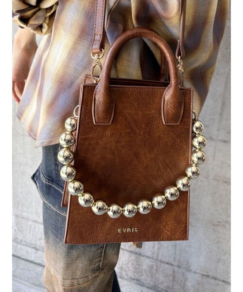 ■デザイン過去に人気だったデザインのリバイバルアイテムです。縦長のスクエアシルエットで奥行きが深いので、コンパクトな見た目よりも容量の入るバックです。ボールチェーンが存在感があり、EVRISらしさのあるモチーフとしてポイントになります。
