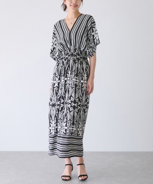 【デザイン・シルエット】パッと目を惹く華やかなプリントが施された、程よい丈感のミディワンピース。Vネックがデコルテを美しく見せ、抜け感をプラスします。ウエストシャーリングで自然なスタイルアップ効果も◎リラックス感のあるシルエットながら、きれいめな印象も兼ね備えた一枚で、デイリーにもリゾートにもぴったりなアイテムです。【素材感】滑らかなレーヨン素材【カラー】02クロ 41コン×ピンク 42コン×オレンジ【スタイリングポイント】一枚で華やかなコーディネートがキマります。透け感のあるアイテムなので、インナー必須です◎デコルテが綺麗に覗くので華奢なネックレスをプラスするのもおすすめ。ハットを合わせてリゾートスタイルも◎裏地:なし光沢感:なし透け感:ありポケット:なし伸縮性:なし生地の厚さ:普通ボタン:なしその他仕様:ウエストシャーリング季節:春夏秋※撮影時の光、お使いのモニター環境によって色の見え方が違う場合がございます。予めご了承ください。モデル身長:168cm 着用サイズ:F