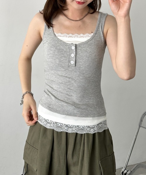 レイヤード風デザインがトレンド感溢れるカップ付きタンクトップ◎ ■Point デイリーに活躍するヘンリーネックタンクトップ! 胸元と裾のレース×レイヤードデザインがポイント◎ 体にフィットしすぎない程よいサイズ感で、伸縮性のあるリブ素材! カップ付きなので、1枚でさらっとストレスフリーに着用可能です♪ ■Style 1枚で着るのはもちろん、シャツや羽織りのインナーとしても◎ デニムパンツやスラックスでカジュアルなスタイルや、 フレアスカートやティアードスカートなどロングスカートと合わせてフェミニンなスタイルなど、 幅広いコーデに活躍するタンクトップです◎ ミニスカート×ブーツで韓国カジュアルなスタイルもおすすめです♪ 【CLEA/クレア】 毎日のシンプルスタイルを、さりげなくオシャレに。 casual fashion every day to you. . . シンプルだけど、どこか女性らしい。 さりげないのに、なんだかオシャレ。 上品さと抜け感のある、 大人カジュアルスタイルをご提案します。 ※ご覧のモニター・撮影環境により実際の商品と多少色味が異なって見える場合がございます。 予めご了承をお願いいたします。 【お買い物をよりお楽しみいただく為に!】 ▼商品のお気に入り登録 ハートをクリック! 完売カラーの再入荷や、ラスト1点の通知、セールの際の通知を受ける事ができます。 ▼ブランドのお気に入り登録 新商品や再入荷など、いち早くブランドのお得な情報を受け取ることができます!