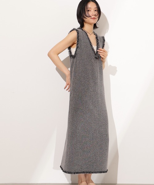 1枚でこなれ感を叶えるナローシルエットのワンピースです。ざっくりと織られたサマーツイードのような素材感が映え、端にフリンジを入れることで退屈しないデザインに。深めのスキッパーネックデザインで抜け感をプラス。インナーを変えるとロングシーズン着ていただけます。<素材>ざっくりと織られた配色感のある素材を使用。綾目が立っていてドライタッチな素材です。裏地が付いているので肌当たりが良いです。<詳細>仕様・開閉なし裏地・あり透け感・なし / 光沢・なし / 伸縮性・なし生地の厚さ・普通●取り扱いについては、商品についている品質表示でご確認ください。●撮影はサンプル商品で行っている為、仕様とサイズが異なる場合がございます。●スタジオ及び屋外で撮影した着用画像は、光の当たり具合やご覧のモニターによって色味が違って見える場合があります。予めご了承ください。●生産時期により色・素材・サイズ感など多少異なる場合がございます。予めご了承ください。≪お買い物をよりお楽しみいただくために!≫・「商品のお気に入り登録」再入荷通知や、ラストの通知、セール通知も受け取ることができます。・「ブランドのお気に入り登録」新商品や再入荷をはじめ、タイムセールやクーポンなどいち早くブランドお得な情報を受け取ることができます。