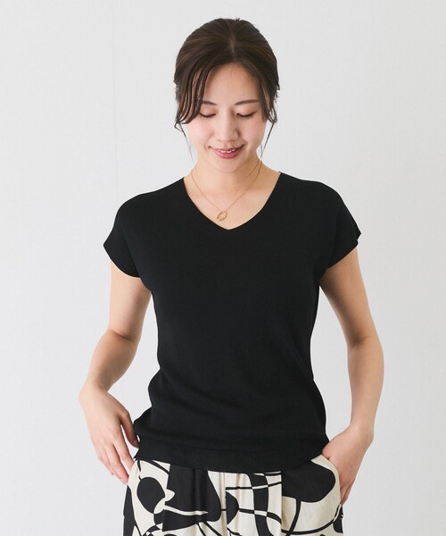 【デザイン・シルエット】 すっきり見えするVネックのフレンチスリーブニット。 程よくボディラインに寄り添うシルエットで、シンプルで落ち着いた印象に。 フレンチスリーブ型のデザインが二の腕をカバーして、着痩せ効果も期待できます。 さらりと落ち感のある素材で見た目にも着心地にも清涼感があり、肌あたりもよいのが魅力の一枚。 【素材感】 さらりとしたニット素材 【カラー】 01クロ 07グレー 27ベージュ 30グリーン 44ブルー 48サックス 60アカ 70オレンジ 86カラシ 【スタイリングポイント】 シンプルなデザインで着回し力も◎ 裾をインしてもアウトでも決まるデザインの為、スカートスタイル、パンツスタイルどちらもはまります。 シンプルなデザインでオフィスなどオンシーンにも活躍。 オフの日はデニムなどできれいめカジュアルなスタイルもおすすめです。 裏地:なし 光沢感:なし 透け感:ベージュ若干あり ポケット:なし 伸縮性:あり 生地の厚さ:薄手〜普通 ボタン:なし その他仕様:なし 季節:春夏秋 ※撮影時の光、お使いのモニター環境によって色の見え方が違う場合がございます。予めご了承ください。 モデル身長:172cm 着用サイズ:F