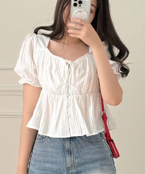 フェミニンな魅力を引き出す一枚。リボン×パフスリーブで仕上げた、甘さと抜け感の絶妙バランスブラウス。■デザイン・ふんわり立体感のあるパフスリーブで華やかさをプラス・胸元のリボンディテールがポイントに・ショート丈でスタイルアップ見え・首元はデコルテが綺麗に見えるネックラインで女性らしさを演出・全体に透け感があり、軽やかでエアリーな印象に■素材・柔らかなコットンポリ素材で着心地も◎・程よい透け感と通気性で、夏にぴったりの軽やか素材・おうちで洗えてお手入れも簡単■スタイリング・ハイウエストボトムと合わせてメリハリコーデに・サロペットのインナーとしてレイヤードしても◎・デニムと合わせて甘さ控えめの大人フェミニンにもおすすめ・スラックスやカーゴパンツ、スニーカーと合わせて甘辛ミックススタイルにも-----------------------------透け感:あり伸縮性:なし裏地:なし------------------------------------------------------------【スタッフが着用しました!】身長:158cm普段着用サイズ:S~Mサイズ今回着用サイズ:FREEサイズ■着用感・コンパクトなショート丈でウエストインせずともバランス◎・ボリュームスリーブが腕回りをカバーしてくれる・軽い着心地で、重ね着なしでも涼しく着られる・フェミニンで甘い印象のトップスで、普段のワイドパンツやデニムにも合わせやすいです!------------------------------------------------【お買い物をよりお楽しみいただく為に】▼お気に入り登録サイズ・カラーを指定して、♡マークをクリック![セール通知・ラスト1点の通知・完売アイテムの再入荷通知]を受け取ることができます。▼ブランドのお気に入り登録新商品や再入荷、タイムセールやクーポン等いち早くブランドのお得な情報を受け取ることができます。------------------------------------------------※取り扱い上のご注意染色の特性上、発汗や摩擦により色落ちしたり他のものに色移りすることがありますのでご注意ください。韓国 オフィスカジュアル春服 ガーリー大人カジュアル韓国ファッション夏服
