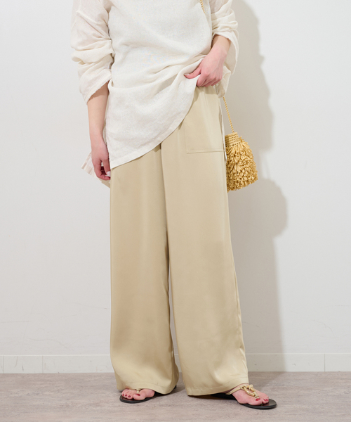 【2025SS】JOURNAL STANDARD relume◆大人の余裕漂う、サテンベイカーパンツ上品な光沢のサテン生地が魅力のベイカーパンツ。カジュアルなディテールながらキレイ目にも着こなせるアイテムです。ゆとりのあるストレートシルエットがリラックスムードと脚長効果を期待できます◎ウエストはゴム仕様でラクな穿き心地も魅力です。ご自宅での手洗いが可能なのでお手入れが簡単なのも嬉しいポイント。同シリーズで下記もございます。ヴィンテージサテンベイカースカート(品番:25060462910020)※取り扱いについては、商品についている品質表示でご確認ください。**********************透け感:なし裏地:なし伸縮性:なし光沢感:ややあり生地の厚さ:普通**********************【スタッフ着用コメント】《スタッフK》身長:158cm/体型:普通/普段サイズ:S/着用サイズ:36サイズ感:全体的に程よいゆとりがあり、リラックスして着用できました。素材感:落ち感のある、さらりとした肌触りで快適です。着心地:軽い着心地で、窮屈感なく過ごせます。**********************※照明の関係により、実際よりも色味が違って見える場合があります。またパソコン・スマートフォンなどの環境により、若干製品と画像のカラーが異なる場合もございます。※商品の色味は、商品アップ画像をご参照ください。本体:手洗い可能