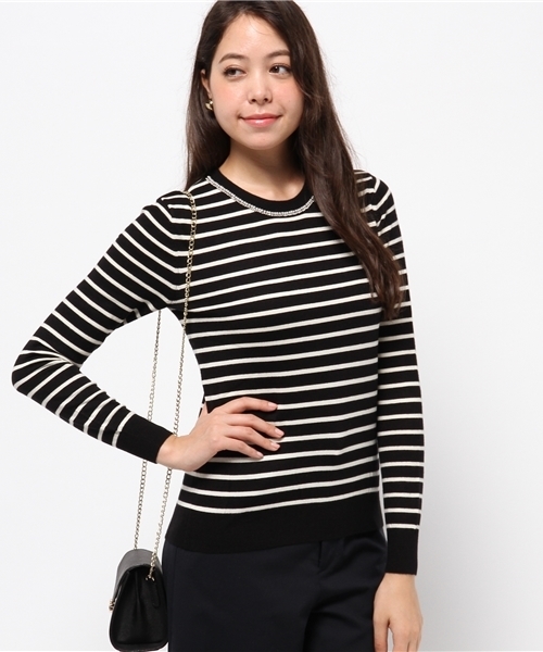ベーシックなラウンドニットの襟元に沿って施されたビジューが華やかなニット!まるで華奢なネックレスをしているかのような見映えのするデザイン。 レーヨン混の柔らかな風合いも大人っぽく、秋先取りなファーストニットに最適です。ボトムスも合わせやすいので、ON・OFFデイリーに使えます。