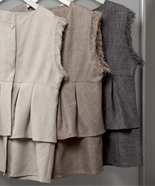 【ミックスフリンジタックフレアベスト】 ・切り替え部分の二段階仕様と袖のフリンジのデザインがポイント ・フロントは大きめのタック入りフリル且つ、高めの位置に切り替えを入れることでスタイルアップ効果あり ・重ね着はもちろん、一枚での着用もおすすめ ・平たいクルミボタンで統一感を持たせ、第一ボタン以外スナップ仕様のため着脱しやすい仕様に ・前開きなので羽織としてもお召しいただけます ・ミックス感のある厚すぎないツイードライクな生地で着やすいアイテム ・後までフリルがついておりバックスタイルまで抜かりないデザイン ※洗濯は軽く押し洗いをしてください。 ※フリンジ部分は、引っ張ったり過度な力を加えますと抜ける可能性があります。 ※フリンジ部分の引っかけにご注意ください。 ※フリンジ部分のほつれが気になる場合は、無理に引っ張らずに気になる糸をハサミで取り除いて下さい。 透け感:なし 伸縮性:なし ※公式オンラインストアと商品カラー名が異なりますのでご注意ください。 オートミール→Mix oatmeal ベージュ→Mix beige グレー→Mix gray lawgy" ラウジーlaugh(笑顔)+ energy(エナジー)毎日笑顔で過ごすエネルギーになりますように。心を込めて…。