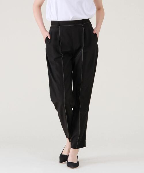 ≪デザインポイント≫ 配色ステッチがポイントのバレルシルエットのパンツです。程よい太さでウエスト後ろゴムが入ることでリラックス感はありながらきれいに見えるのがポイントです。 ≪素材・着心地≫ アセテートを使用したファイユ素材で、程よい光沢感があります。さらっとして肌離れがよく、春夏に最適な素材感です。 ≪おすすめの着こなし≫ Tシャツなどカジュアルなトップスはもちろん、セットアップでもお勧めです。 透け感:なし 伸縮性:なし 光沢感:ややあり 裏地:なし 生地の厚さ:やや薄い