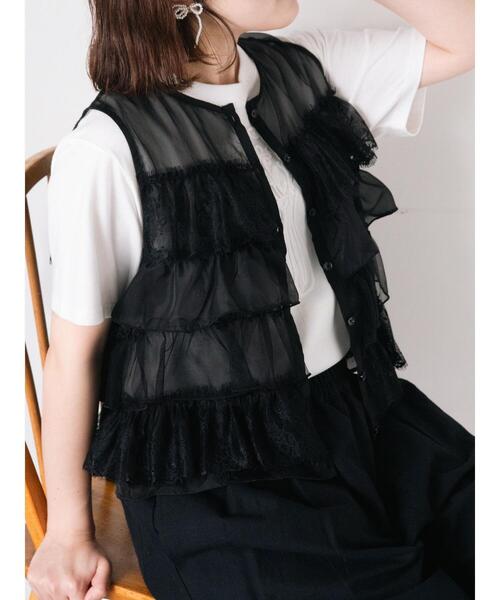 異素材フリルが上品な華やかさを演出するベスト。 ほんのりとしたシアー感のあるデザインも女性らしさを一層引き立たせてくれます。 シンプルなTシャツやワンピースとレイヤードするだけでも、新鮮なコーディネートが楽しめるアイテムです。 ※商品画像は、撮影環境やお客様のご利用のPC・スマートフォンのモニター環境などにより実物と色味に差異がある場合がございます。