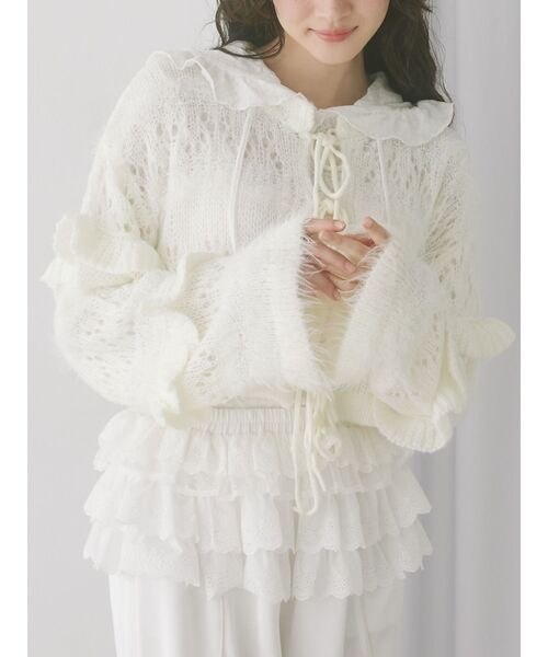 ※一番上の段のリボン位置はもう少し上に修正いたします。※リボンが現状長いので若干長さを削ります。袖裾のファー長さは半分になります。※繊細な透かし編みニットのため保管方法は畳みを推奨いたします。 ■デザイン ふわふわの透かし編みボーダーが可愛いニットカーディガン。テープ糸やシャギーなど様々な糸が組み合わさっているのがpoint。リボンを結んで着用いただくデザインです。■サイズ ゆるっとしたサイズ感で、レイヤードのしやすいサイズに仕上げています。 ■スタイリング ワンピースやトップスの上に重ねるのはもちろん、デニムパンツなどカジュアルなアイテムとの合わせもおすすめです。 【商品情報】透け感:な裏地:なし伸縮性:あり光沢感:なし生地の厚さ:薄い【商品のお気に入り登録】♡をクリック!完売カラーの再入荷や、ラスト1点の通知、セールの際の通知も受け取ることができます。【ブランドのお気に入り登録】新商品や再入荷など、merryの情報をいち早くお知らせします!ぜひご登録ください♡