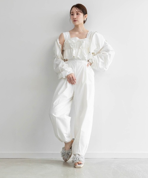 ◆2025SS新商品◆ カジュアルさとフェミニンさの絶妙なバランスがポイントのコンビネゾン。 程よい肌見せやフリルデザインなどこだわりのディテールが女性らしさを引き立ててくれます。 アウトドアにもデイリーユースにも対応できる万能アイテムです。 POINT ・カジュアル感のある素材にフリルを組み合わせ、フェミニンに仕上げたデザイン ・サイドのカットアウトデザインの程よい肌見せで、パンツスタイルも女性らしい印象に ・スタイルアップ効果が期待できる高めのウエスト位置 ・サイドのリボンを閉めても着用可能で、どの角度から見ても着映えするデザイン ・裾はドロストデザインにも出来る金具付き ・生地に撥水加工/UV50%カットを施しているため、街歩きやレジャー用のアウターとしても活躍するアイテム COORDINATE 1枚での着用はもちろん、シアートップスなどのレイヤードスタイルも◎。 シンプルなインナーや羽織りと合わせる事で、フリルがアクセントになり、女性らしさを引き立てます。 同素材で制作したマウンテンパーカー(BJ35317)と合わせてセットアップで着用していただくのもおすすめです。 - - - - - - - - - - - - - - - 洗濯方法:家庭洗濯不可 透け感:ややあり 裏地:あり 伸縮性:なし 生地の厚さ:薄手 - - - - - - - - - - - - - - -