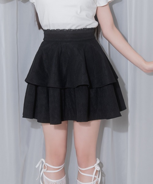 リボン柄のレースが重ねられた2段スカート♡ボリューム感や繊細なレースがポイント♪ レースリボンAPパフスリーブTシャツと同じリボン柄のレースを使用しているのでセットコーデもオススメです◎