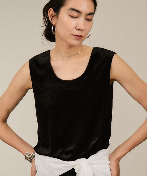 ■デザイン/シルエット リッチなベロア素材を生かした、ミニマルなデザインのノースリーブトップス/タンクトップ。 きれいめな素材をカジュアルなシルエットに仕上げることで大人の抜け感あるアイテムに。 体のラインを拾いすぎない程よいゆとりのあるサイズ感と、 短すぎないクロップド丈で様々なボトムとバランスの取りやすい一枚。 前後2WAY着用可能でその日のスタイリングによって衿回りの見え方に変化をつけることができます。 上質感のあるブラック、ニュアンスベージュの2色展開です。 ■素材 リッチな風合いが特徴のアセテート混のベロアです。 シルクの様なしなやかさと発色の良さ、上質な光沢感、軽やかな仕上げで長いシーズン着用可能です。 ■コーディネート 同素材のスカートとのセットアップやデニムなど、カジュアルダウンしたコーディネートもおすすめです。 残暑や肌寒くなってからもインナーとして長いシーズン着用可能なのも嬉しいポイントです。 ■トリアセベロアシリーズ一覧 ・商品番号:SHM35440 商品名:トリアセベロア前後2WAYノースリーブ/タンクトップ ・商品番号:SHM35430 商品名:トリアセベロアボックスTシャツ ・商品番号:SHC35430 商品名:トリアセベロアナロースカート ■モデル身長:173cm 着用サイズ:F(ロングヘアモデル) ■モデル身長:166cm 着用サイズ:F(ミディアムヘアモデル) ----------------------------- 裏地:なし 光沢感:あり 透け感:なし 伸縮性:ややあり 生地の厚さ:やや薄手 -----------------------------