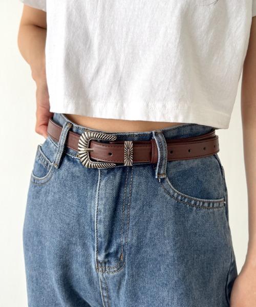 ヴィンテージ感漂うシルバーバックルがアクセントになった、フェイクレザーのウエスタンベルト。 程よい太さとしなやかな素材感で、パンツスタイルはもちろん、ワンピースのウエストマークにもぴったり。ウエストから腰穿きまで幅広く対応でき、スタイリングにトレンド感をプラスします。 カジュアルにもきれいめにも合わせやすい、1本持っておきたい万能ベルトです。 【お買い物をよりお楽しみいただく為に!】 ー商品のお気に入り登録ー ハートをクリックして頂くと、完売カラーの再入荷通知や、ラスト1点の通知、セールの通知も受け取ることができます。 ーブランドのお気に入り登録ー 新商品や再入荷など、いち早くブランドのお得な情報を受け取ることができます! ※他のキャンペーンにより、期間中に価格が変動する場合があります。 ※セールは予告なく終了させていただく場合もあります。